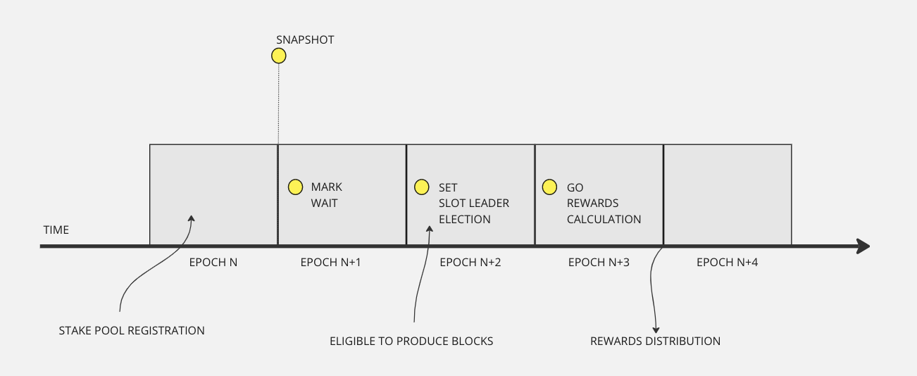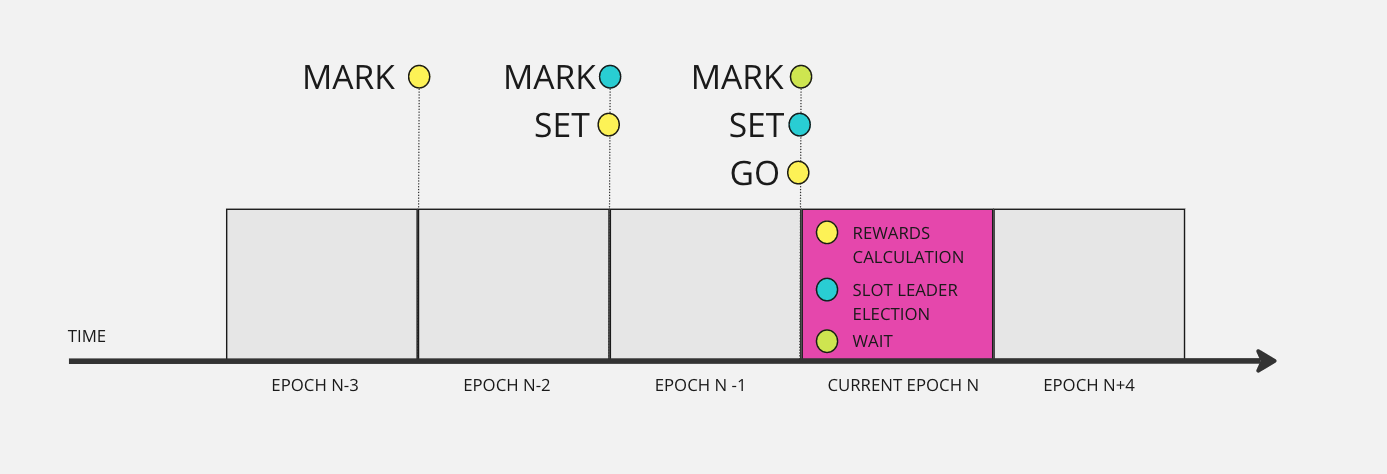 A snapshot **Mark** at epoch transition from *EpochN* to *EpochN+1* will be used for the slot leader election process during *EpochN+2*, when it becomes **Set**. Finally, it is employed for rewards calculation during *Epoch N+3* when it becomes **Go**.